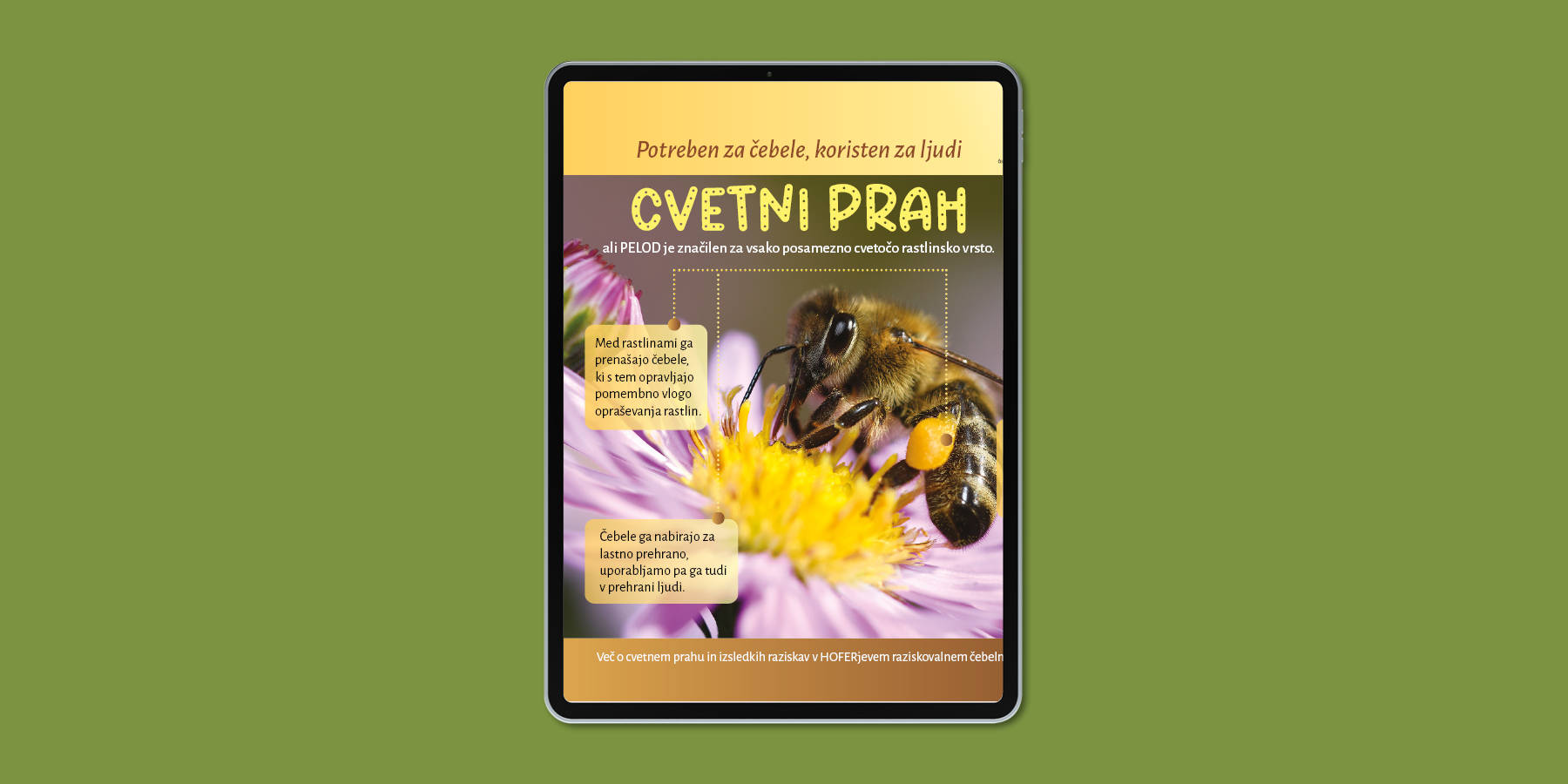 Ob 10-letnici projekta Skrbimo za medeno prihodnost smo v sodelovanju s ČZS in z dr. Natašo Lilek (Medex d.o.o.) pripravili brošuro o cvetnem prahu, ki je središče večletnih raziskav v HOFERjevem raziskovalnem čebelnjaku.
