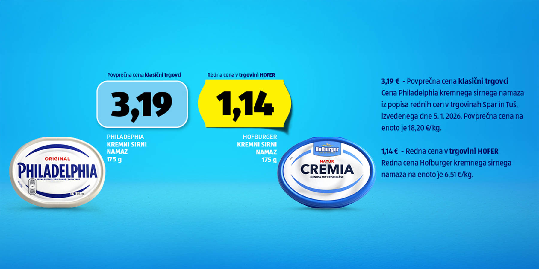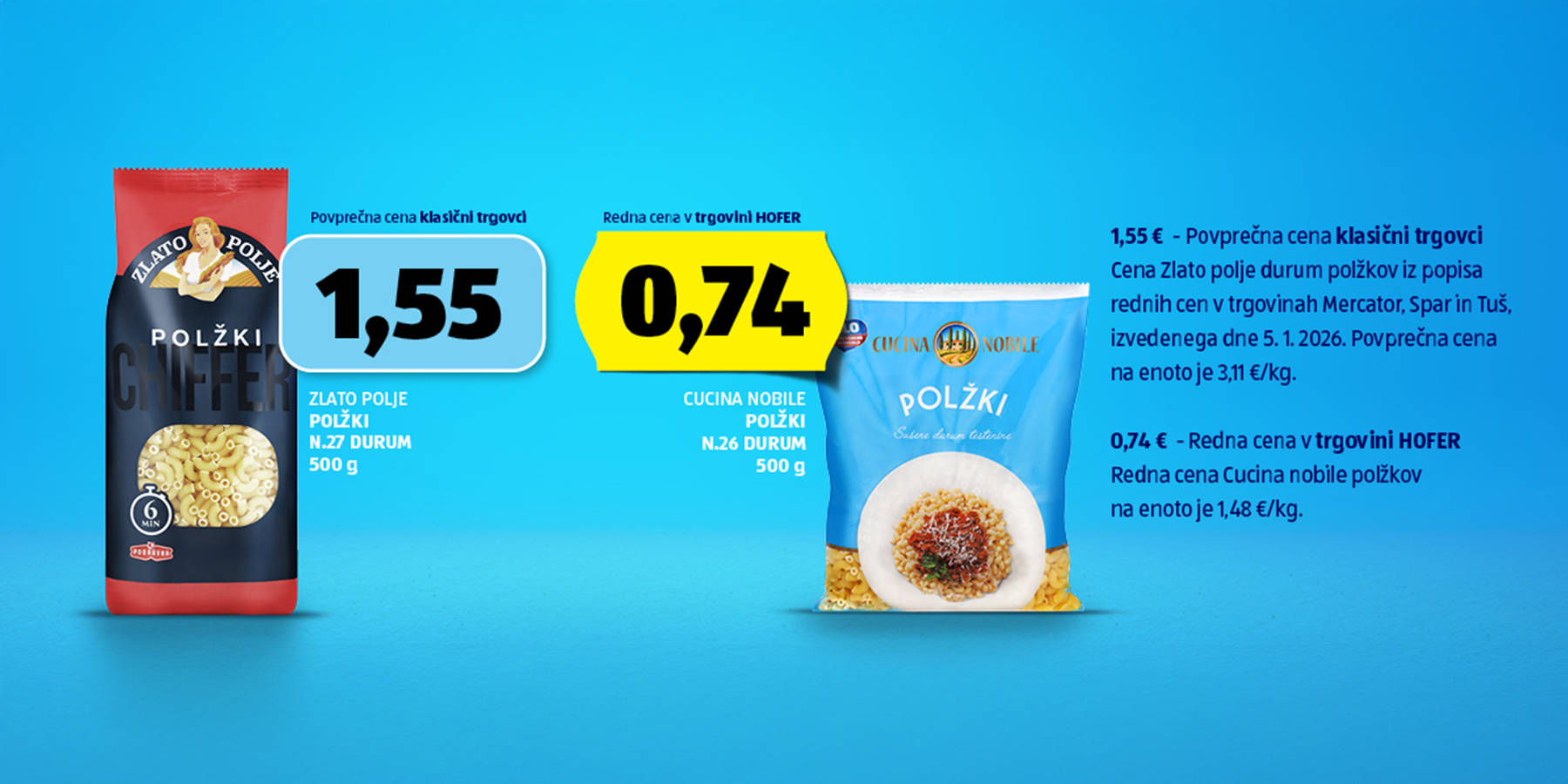 Z našimi lastnimi blagovnimi znamkami zagotavljamo preverjeno visoko kakovost po najboljši HOFER CENI. Do sedaj smo primerjali le posamezne izdelke in čas je, da primerjamo kar celotno nakupovalno košarico. Izbrali smo 22 izdelkov, ki so skozi leto pogosto del nakupa. Za objektivno primerjavo smo kupili uveljavljene blagovne znamke v trgovinah Mercator, Spar in Tuš, ter nato še primerljive izdelke lastnih znamk v trgovini HOFER.