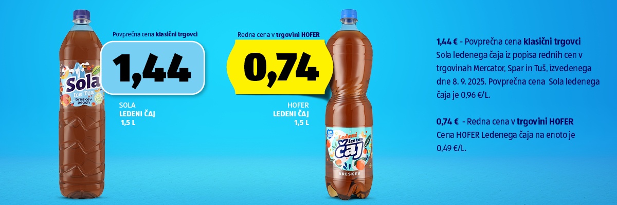 Cene veljajo na podlagi popisa rednih cen pri HOFERju in večjih trgovcih, ki je bil izveden dne 8. 9. 2025, za Flying Power in ledeni čaj je bil popis cene izveden dne 6. 11. 2025. V primerjavo so vključene trgovine Hipermarket Mercator (Cesta talcev 4, 1230 Domžale), Hipermarket Spar (Virska cesta 21,1233 Dob) in Tuš supermarket (Mestni trg 1, 1230 Domžale). V primerjavi so upoštevane redne cene navedenih trgovcev na slovenskem trgu. V primerjavo niso vključene akcijske cene omenjenih izdelkov.