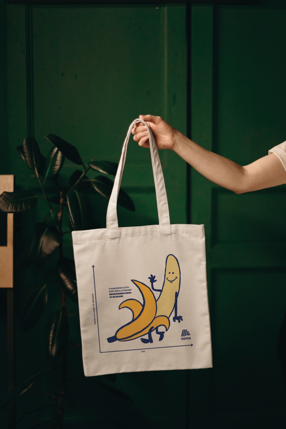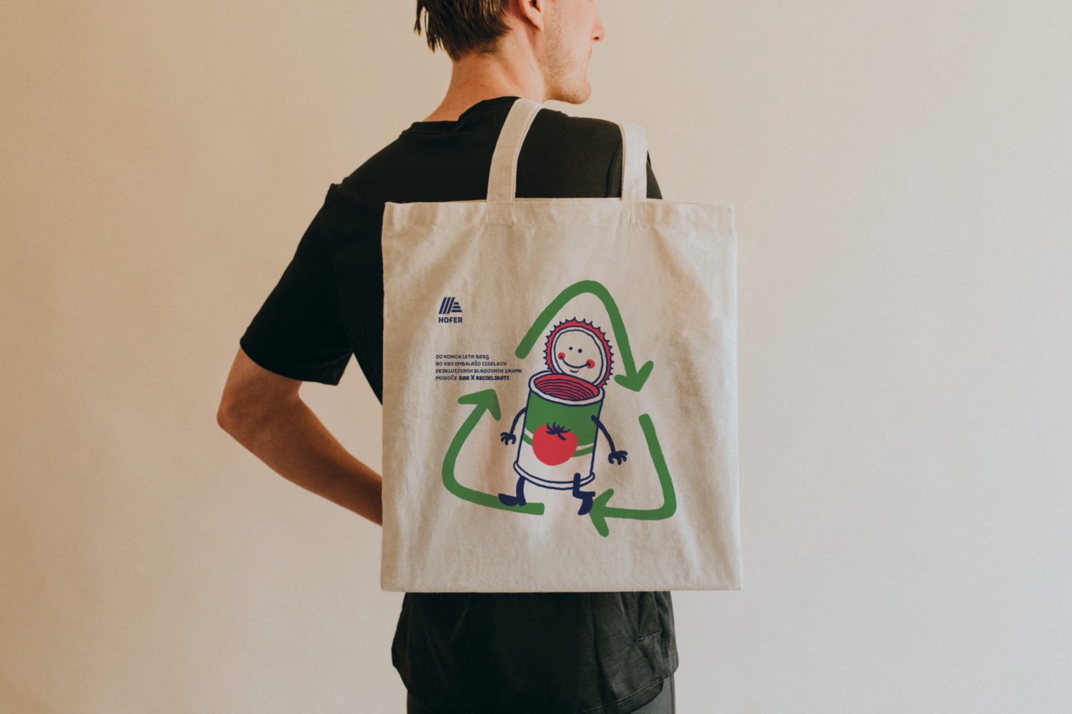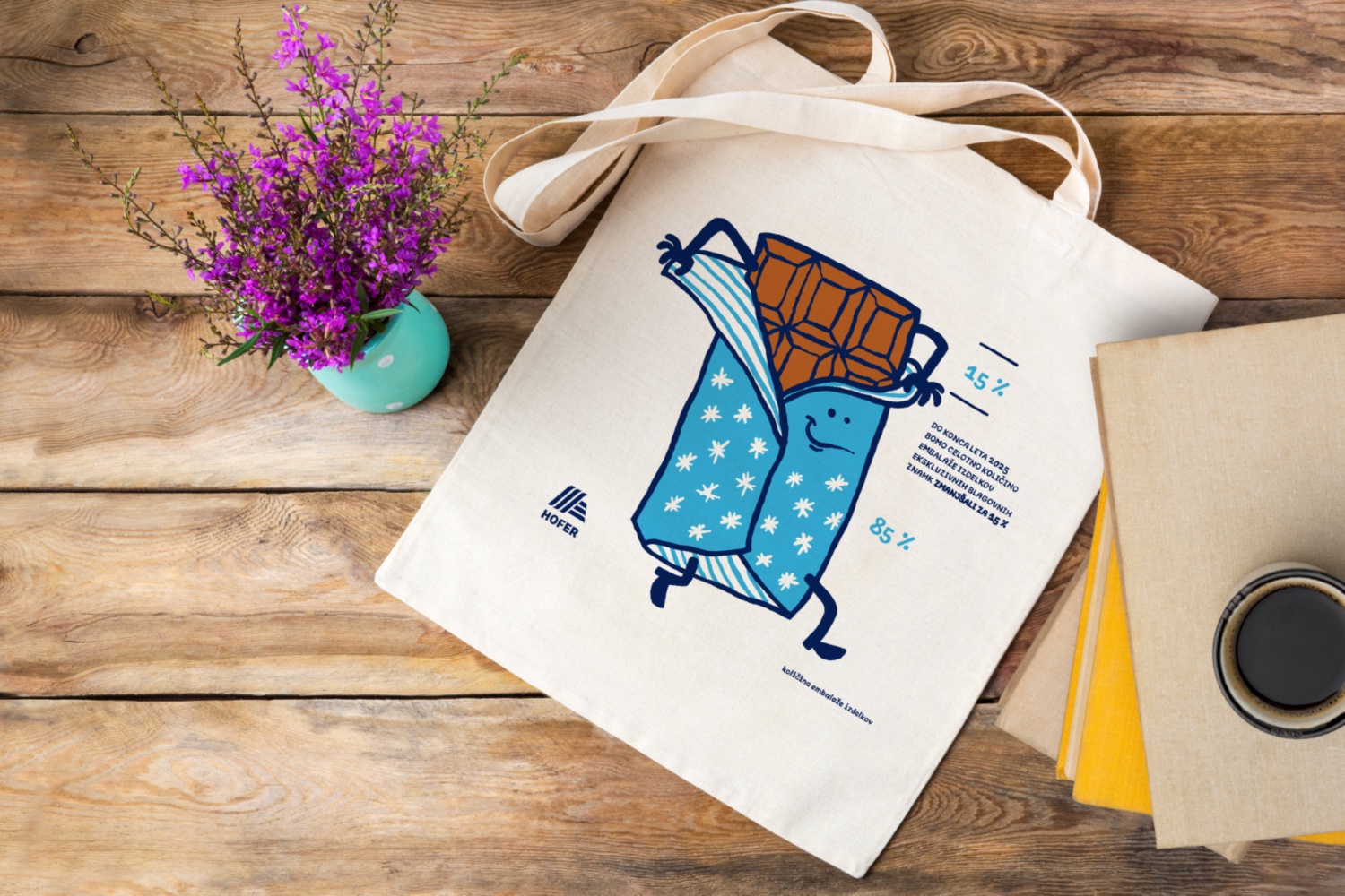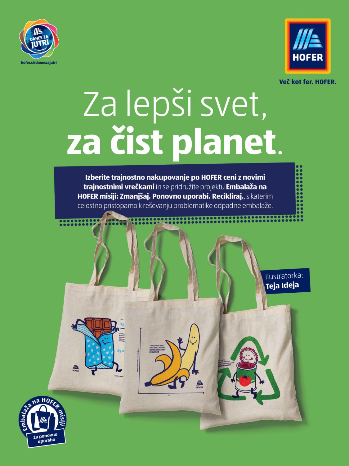 Lukovica, 4. november 2021: Pri HOFERju pripisujejo velik pomen varovanju okolja, zato imajo v svoji ponudbi že od leta 2018 vključene trajnostne nakupovalne vrečke iz certificiranega Fairtrade bombaža. Da bi bile trajnostne vrečke kar najbolj sporočilne in vizualno privlačne, so se v sklopu projekta »Embalaža na HOFER misiji: Zmanjšaj. Ponovno uporabi. Recikliraj.« povezali z domiselno ustvarjalko Tejo Idejo. Skupaj so razvili motive, ki prikazujejo zadane trajnostne cilje podjetja. Vrečke z ilustracijami čokolade, banane in pločevinke so že na voljo v vseh trgovinah HOFER.
