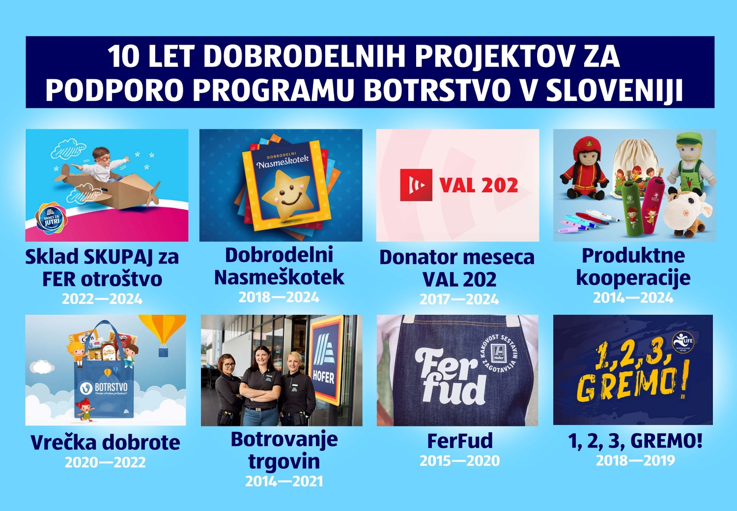Od leta 2014 so pri HOFERju izpeljali številne dobrodelne projekte. Med drugim je bila vsaka trgovina HOFER botra enemu otroku iz programa Botrstvo, z različnimi dobrodelnimi izdelki, kot so medvedki, pisala, ročne lutke itn., so se zbirala sredstva za otroke, prav tako s prostovoljnimi prispevki ob nakupu FerFud jedi. Pri podjetju HOFER so Botrstvu namenili tudi sredstva za vsak pretečen kilometer ob zaključnih tekih projekta 1, 2, 3, GREMO! HOFERjevi kupci so z nakupom dobrodelnih piškotov Nasmeškotkov zbirali sredstva za plačilo stroškov bivanja v dijaških domovih, z nakupom Vrečke dobrote pa so podprli družine v stiski. Pred dvema letoma je HOFER ustanovil Sklad SKUPAJ za FER otroštvo in vanj tudi letos prispeval 65.000 evrov.