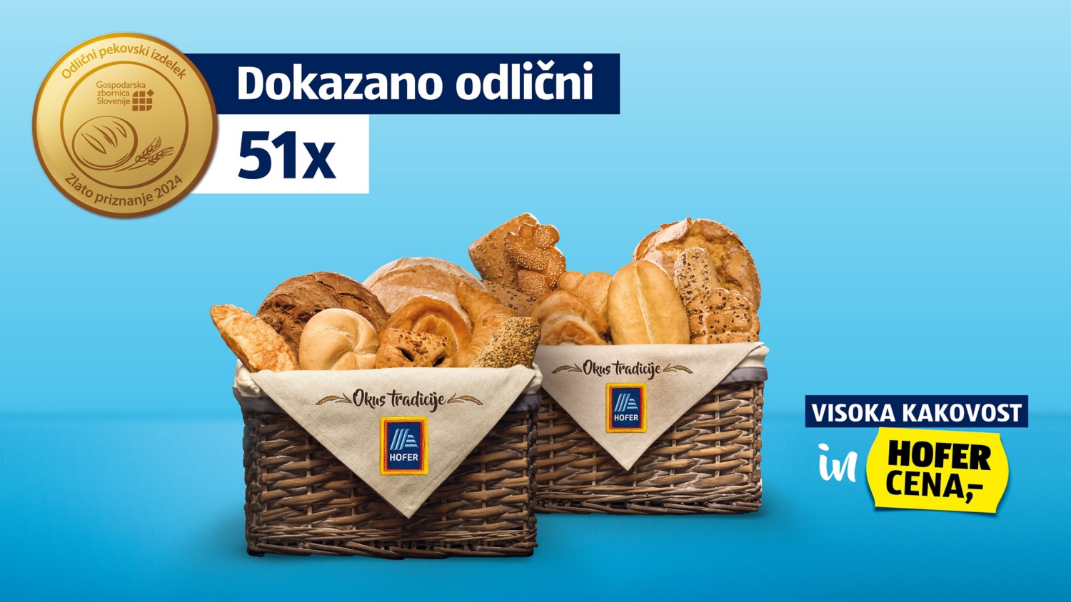 Zbornica kmetijskih in živilskih podjetij Gospodarske zbornice Slovenije je že 24. leto podelila zlata priznanja za odlično kakovost, ki jih je letos prejelo kar 51 vrst pekovskih izdelkov HOFERjevih lastnih blagovnih znamk. Sveže pečen kruh, pecivo in druge pekovske dobrote priznanih slovenskih dobaviteljev večkrat dnevno pečejo v vseh 92 trgovinah HOFER po Sloveniji in tako kupcem že od leta 2015 zagotavljajo vedno sveže in hrustljave izdelke. Med vsemi izdelki je blejska kremšnita prejela prav posebno nagrado, saj je z zlatim odličjem nagrajena že peto leto zapored.