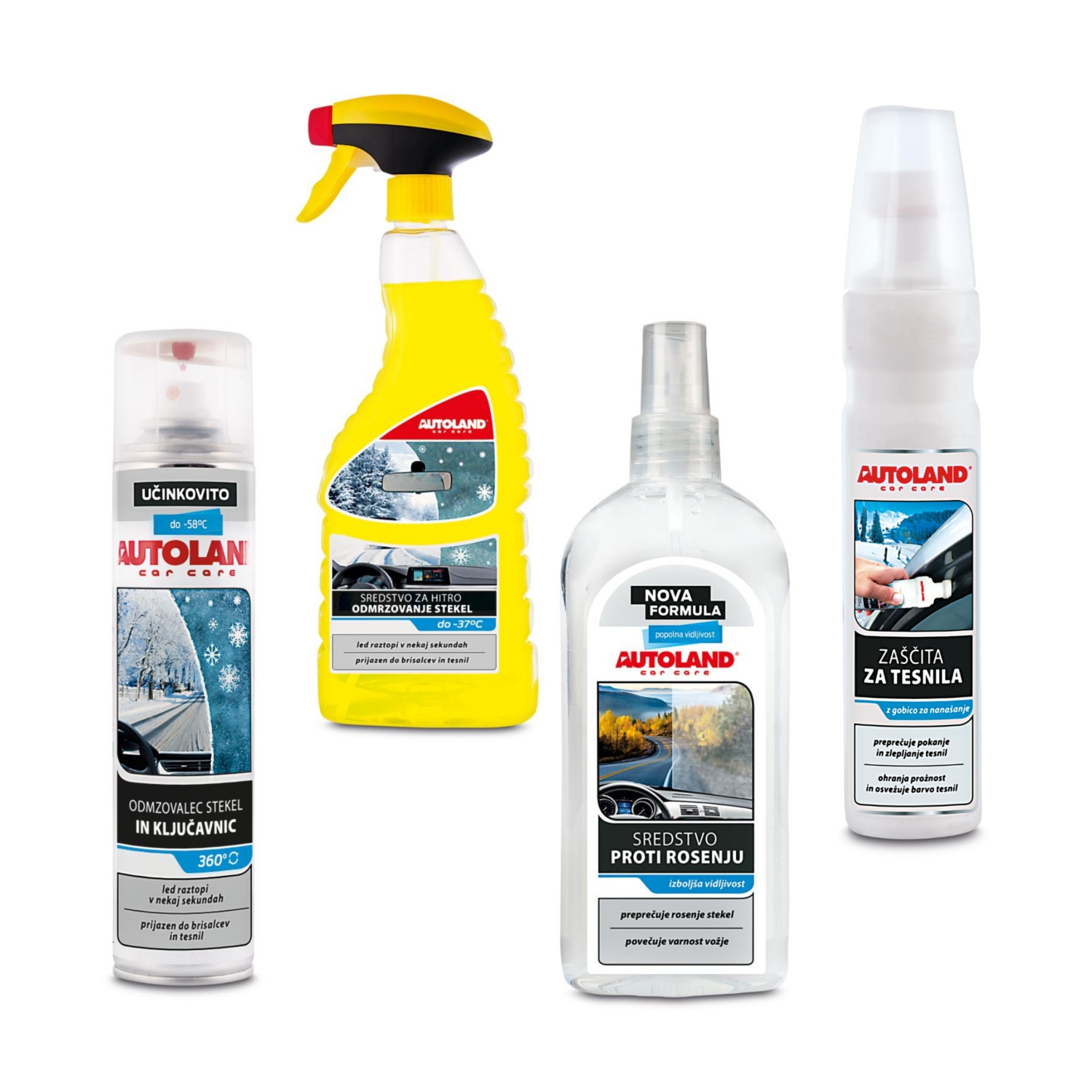 - sredstvo za odmrzovanje stekel, 750 ml/sredstvo za odmrzovanje ključavnic in stekel, 300 ml: hitro odstrani led, steklo pa ostane čisto in se ne blešči, tudi za odstranjevanje ledu in zmrzali z metlic brisalcev, žarometov, ogledal in ključavnic, ali