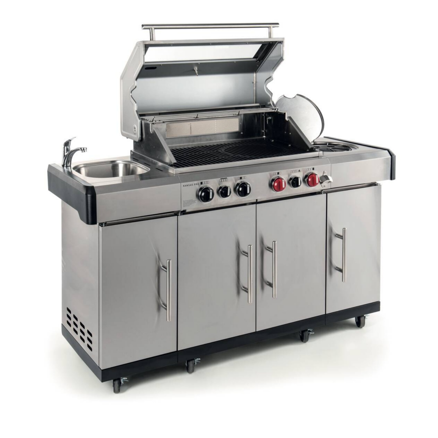- za peko na žaru je na voljo več območij, dve s funkcijo TURBO ZONETM sta izredno vroči in zato brezstopenjsko nastavljivi gorilniki za zmogljivo posredno in neposredno peko na žaru upravljalni gumbi z vgrajenim piezo vžigom (vžig plina z iskro)