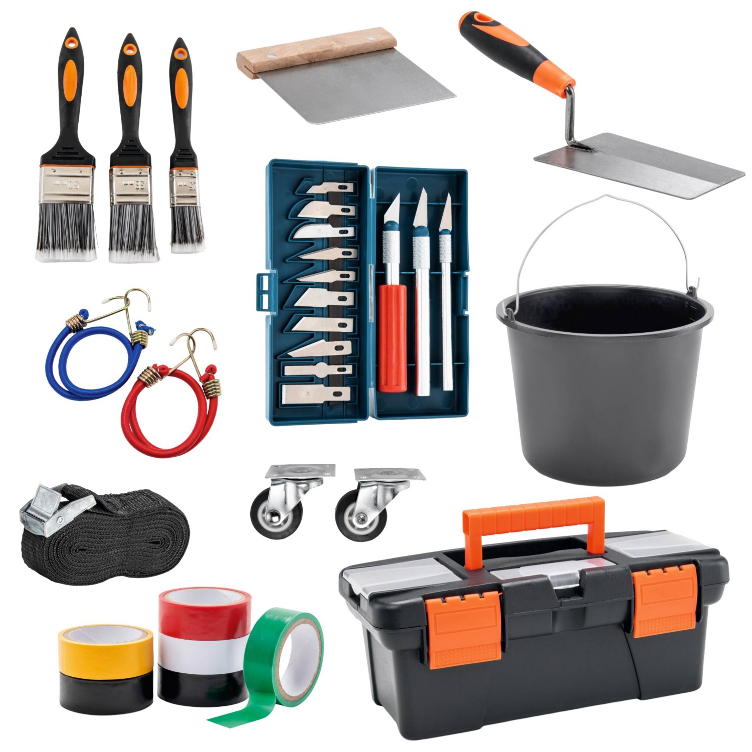 zaustavljalnik vrat, tesnila, vodna tehtnica, kovček za orodje, komplet žebljev itd.