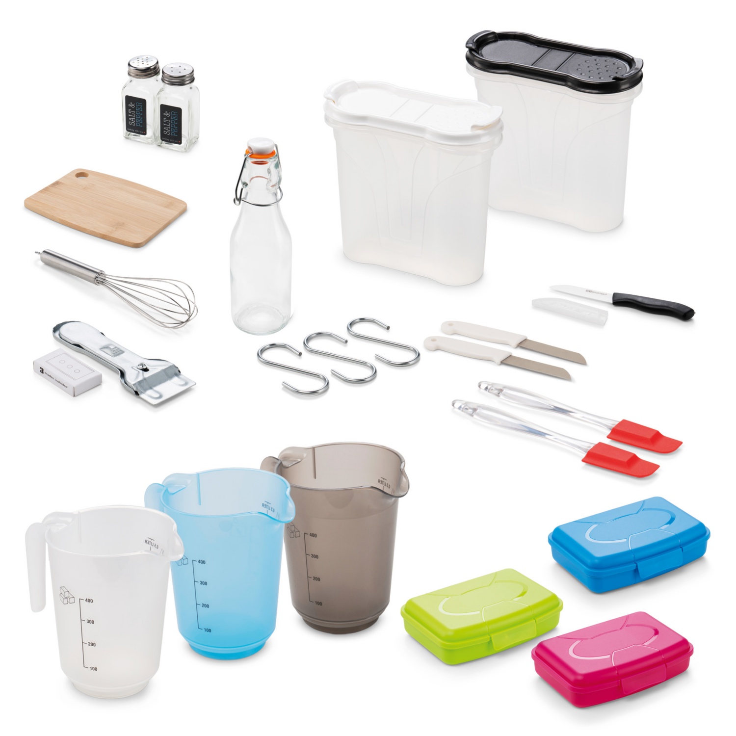 metlica za stepanje, merilni lonček, posoda za malico, kuhinjski nož, kuhinjske deske, lopatica za testo, ...