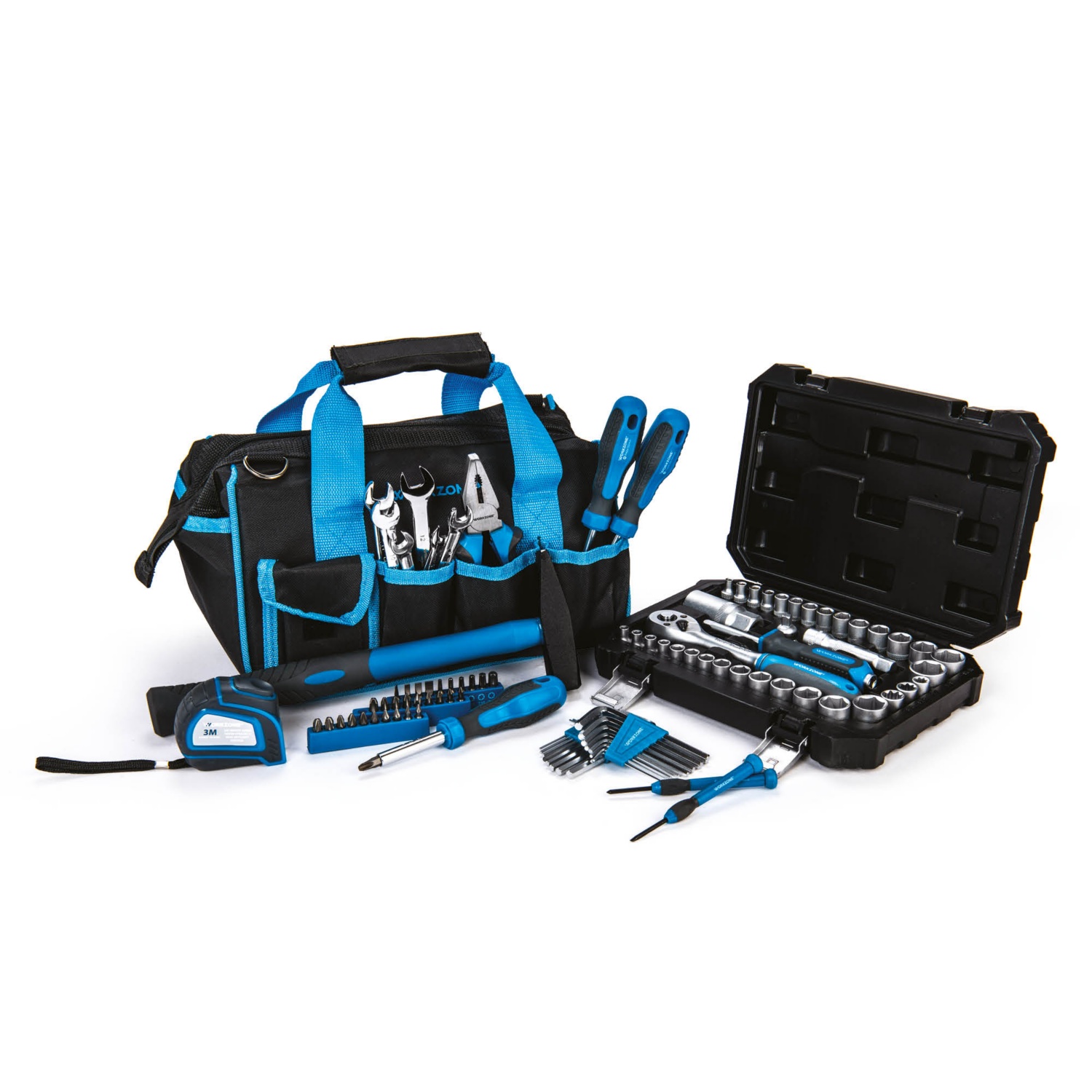 z 39-delnim kompletom nasadnih ključev z nastavki, 30-delnim kompletom vijačnih nastavkov, različnimi orodji itn.