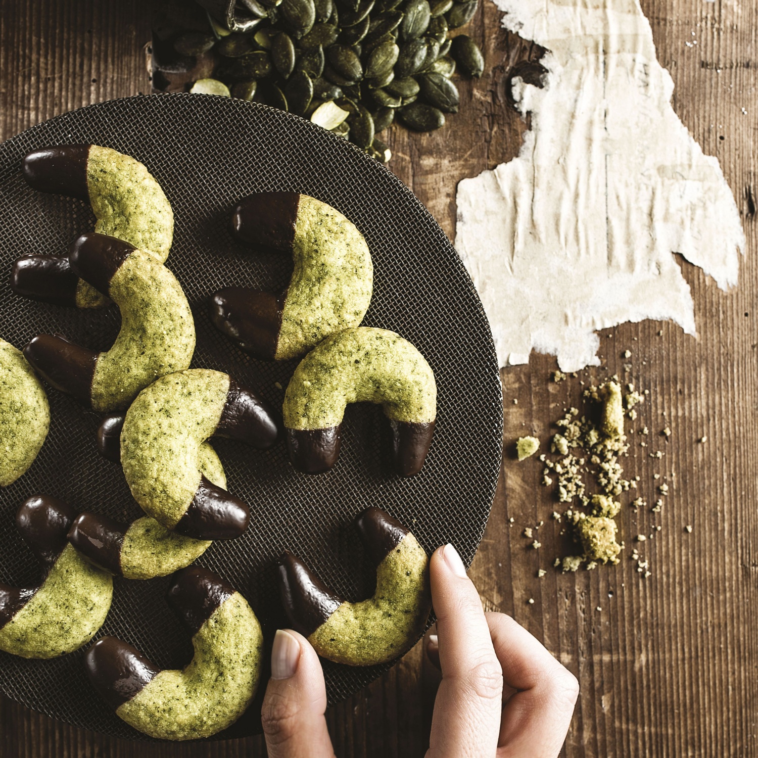 - Iz masla, moke, sladkorja v prahu, vaniljevega sladkorja, soli in sesekljanih bučnih semen zamesimo testo, ki ga pustimo počivati na sobni temperaturi približno 1 uro.