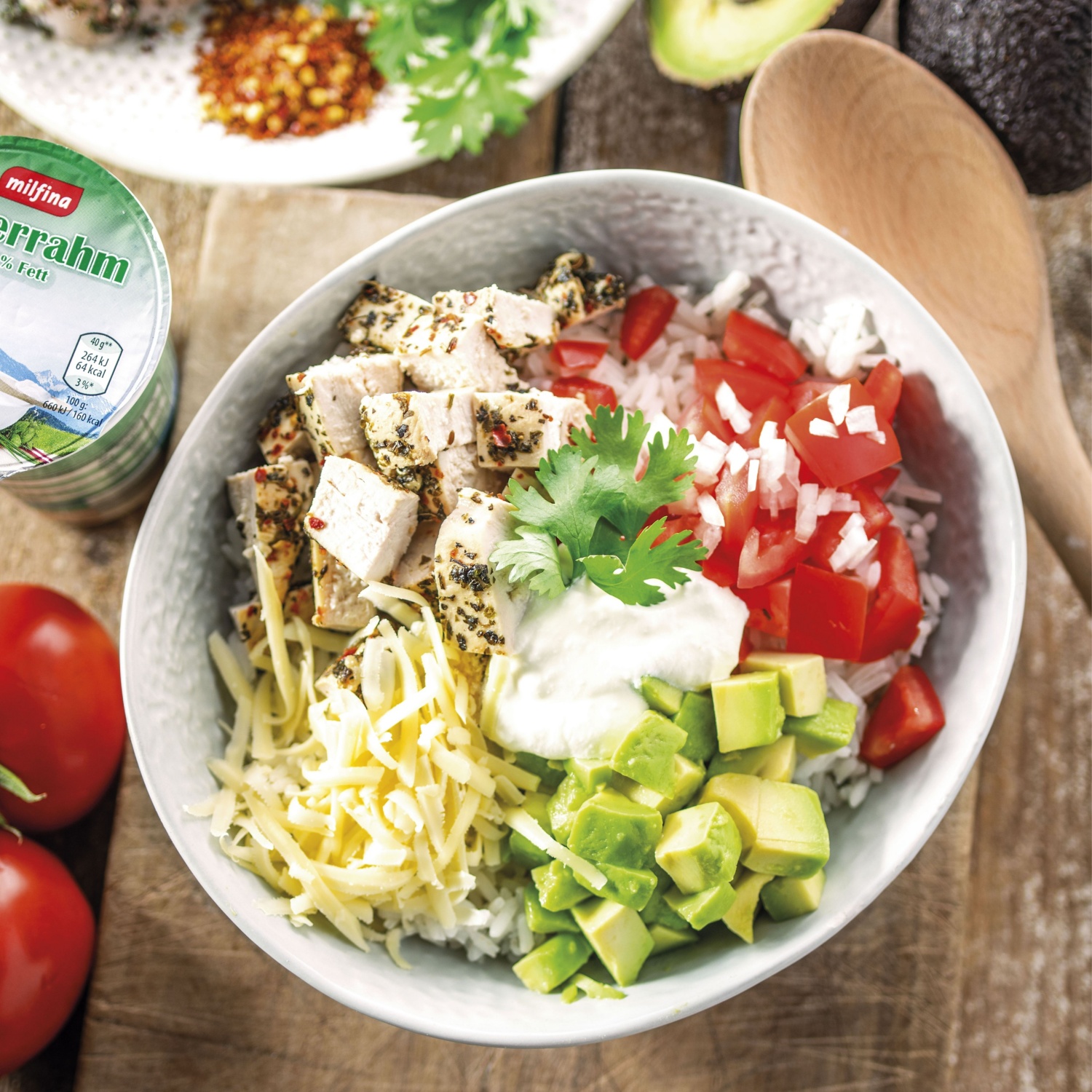 Dno globokega krožnika prekrijemo z rižem, na katerega razporedimo pečene piščančje prsi, paradižnik, čebulo, avokado in mocarelo.
