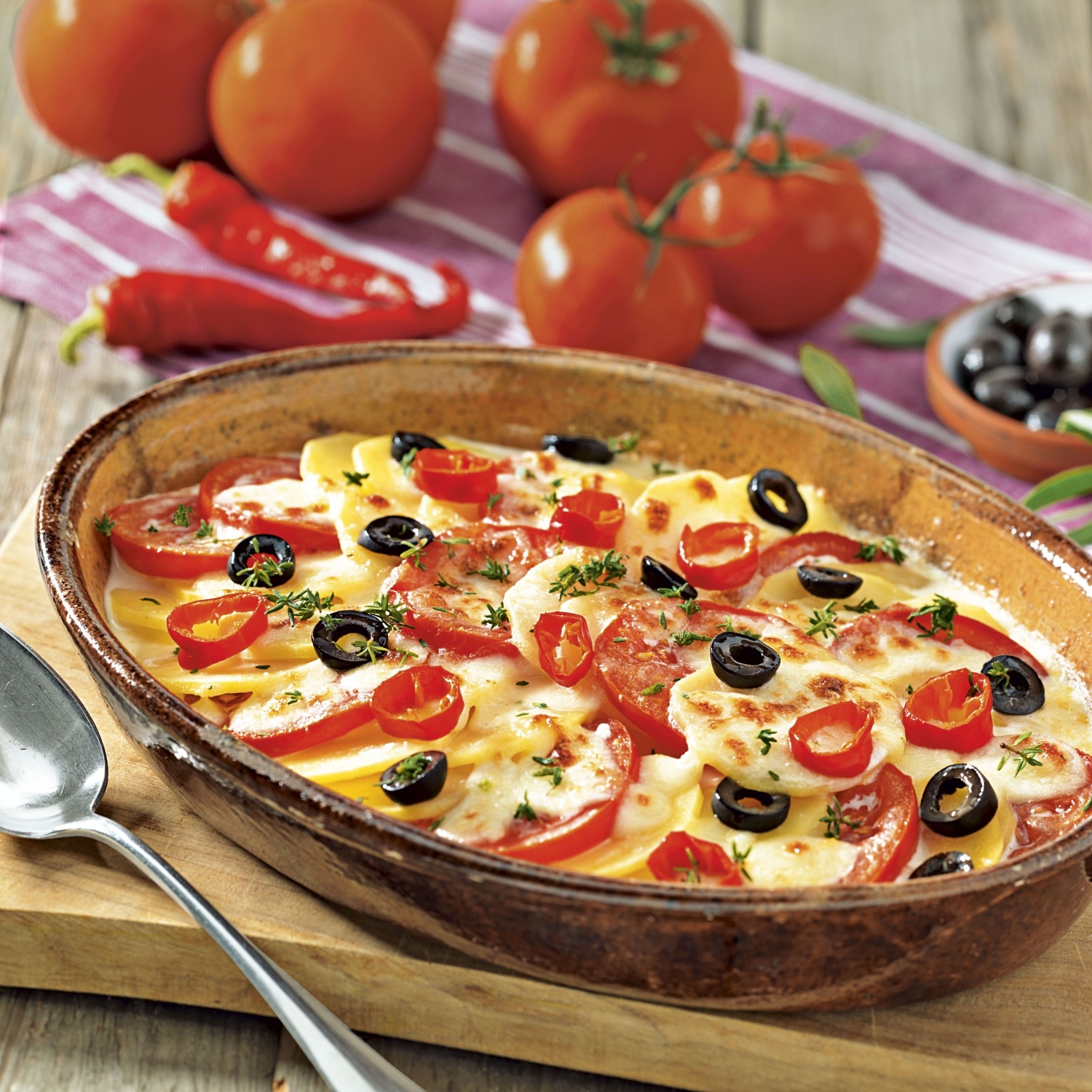 3. Medtem rezine krompirja in paradižnika v plasteh nadevamo v pekač.