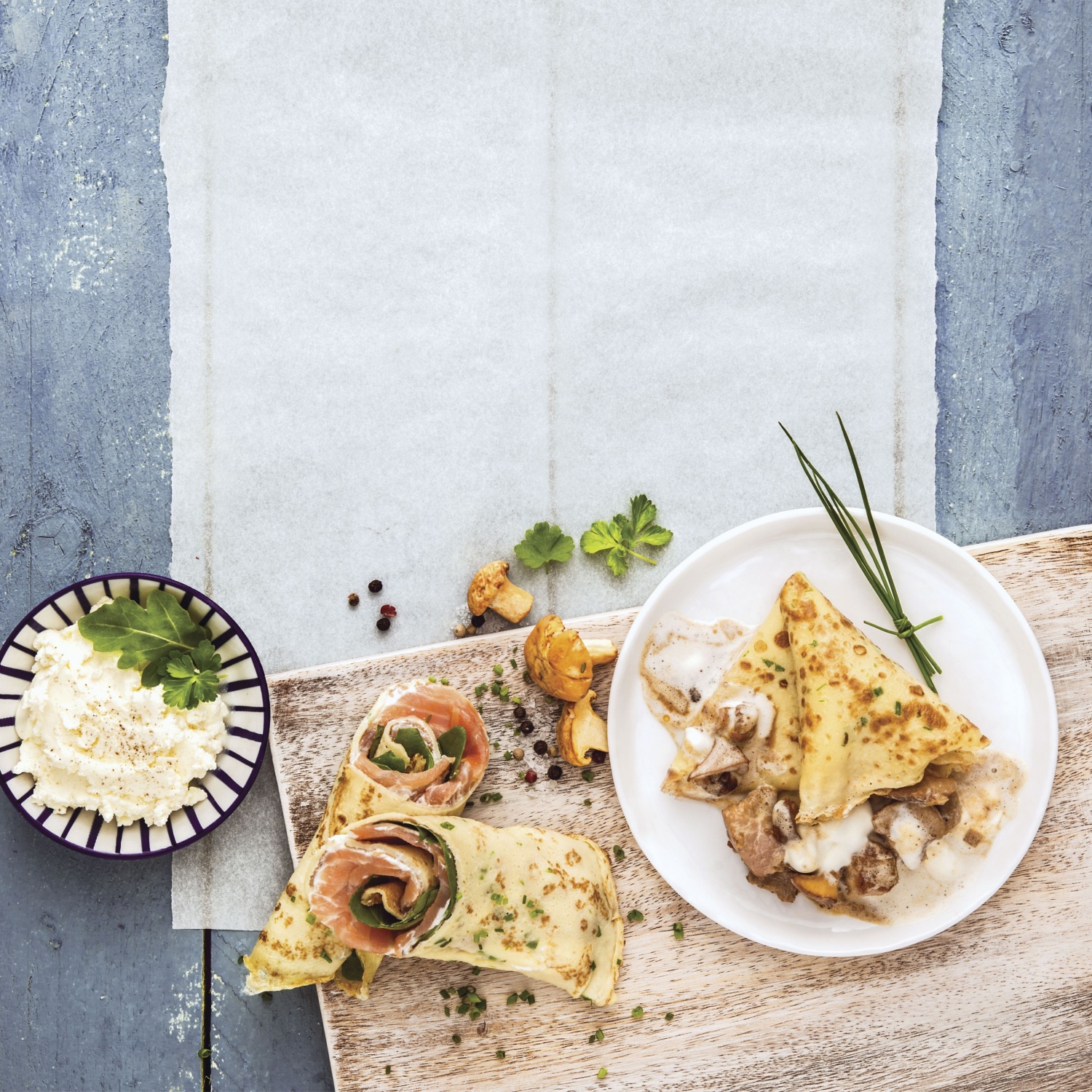 Recept za okusne slane palačinke. Pripravite palačinke z zelišči, rukolo, namazom svežega sira in prekajenim lososom. Podroben opis spodaj