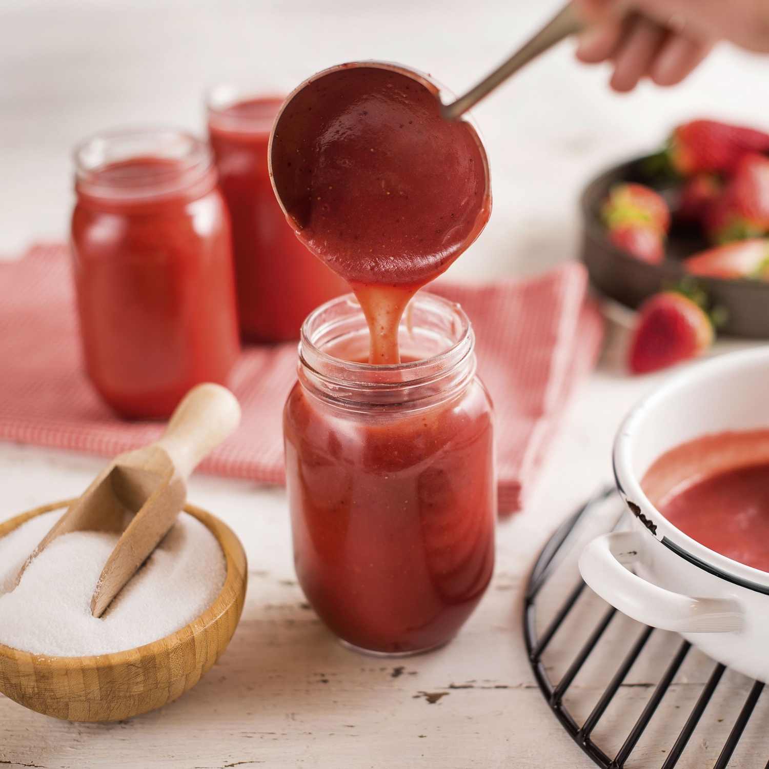Jagode operemo, očistimo in razpolovimo. Damo jih v lonec, temeljito zmešamo z želirnim sladkorjem in citronsko kislino ter vremo vsaj 3 minute.