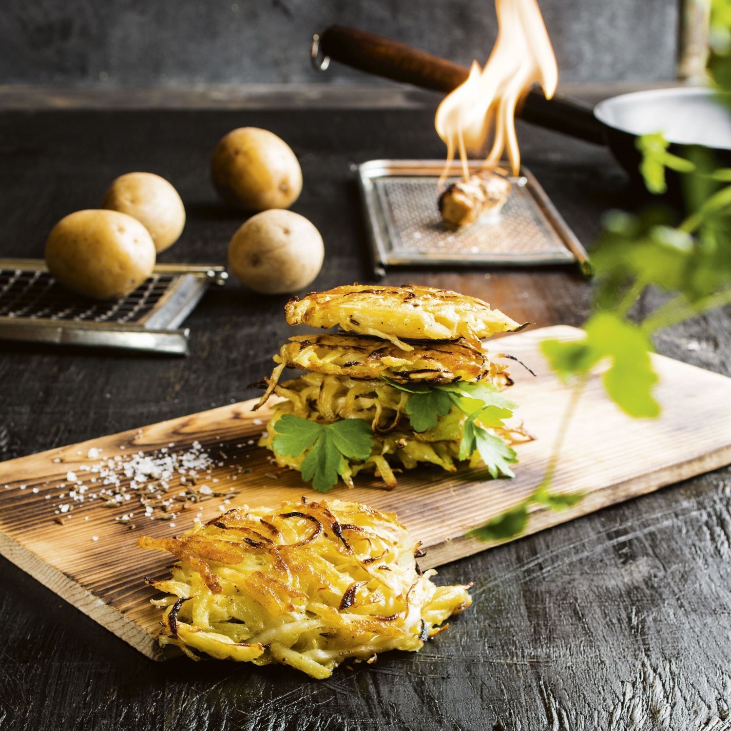 - Olupljen krompir grobo nastrgamo in temeljito ožamemo, čebulo drobno sesekljamo.