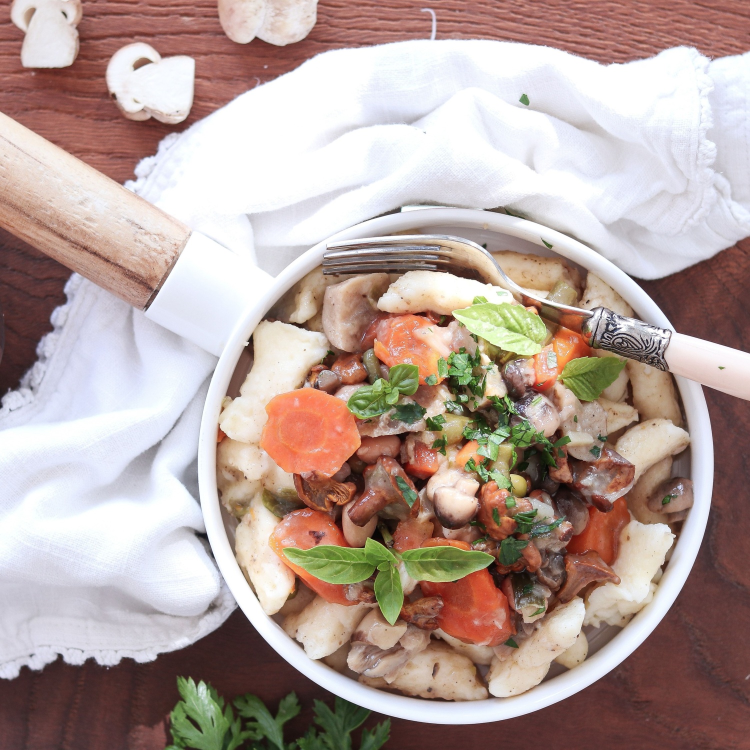 Recept za njoke in omako iz zelenjave in gob. Okusna ideja za lahko kosilo ali večerjo. Podroben opis spodaj