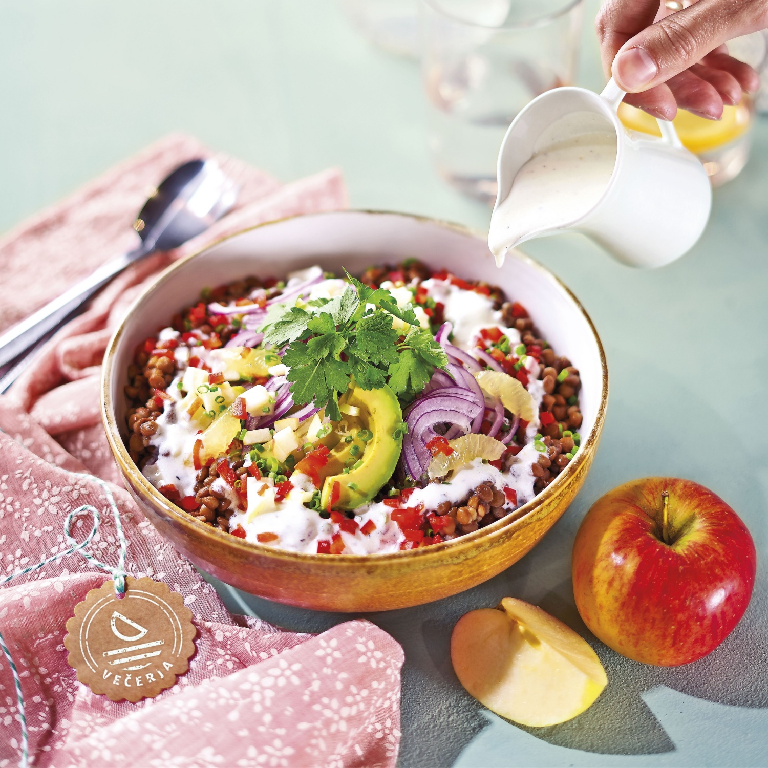 Sveže poletno kosilo ali hitra in zdrava malica. Lečina solata z avokadom, papriko, čebulo, jabolkom in jogurtovim prelivom s poprom. Podroben opis spodaj