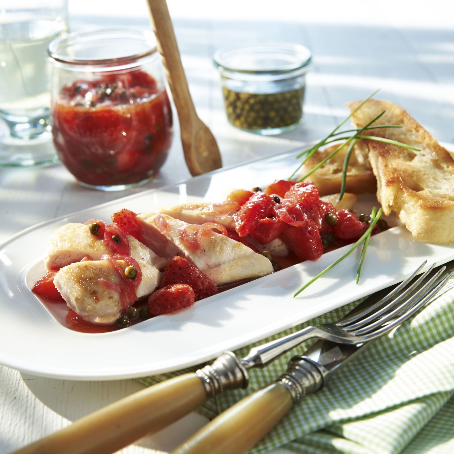 - Piščančje fileje narežemo ter postrežemo z jagodnim čatnijem in popečenimi rezinami štručke.
