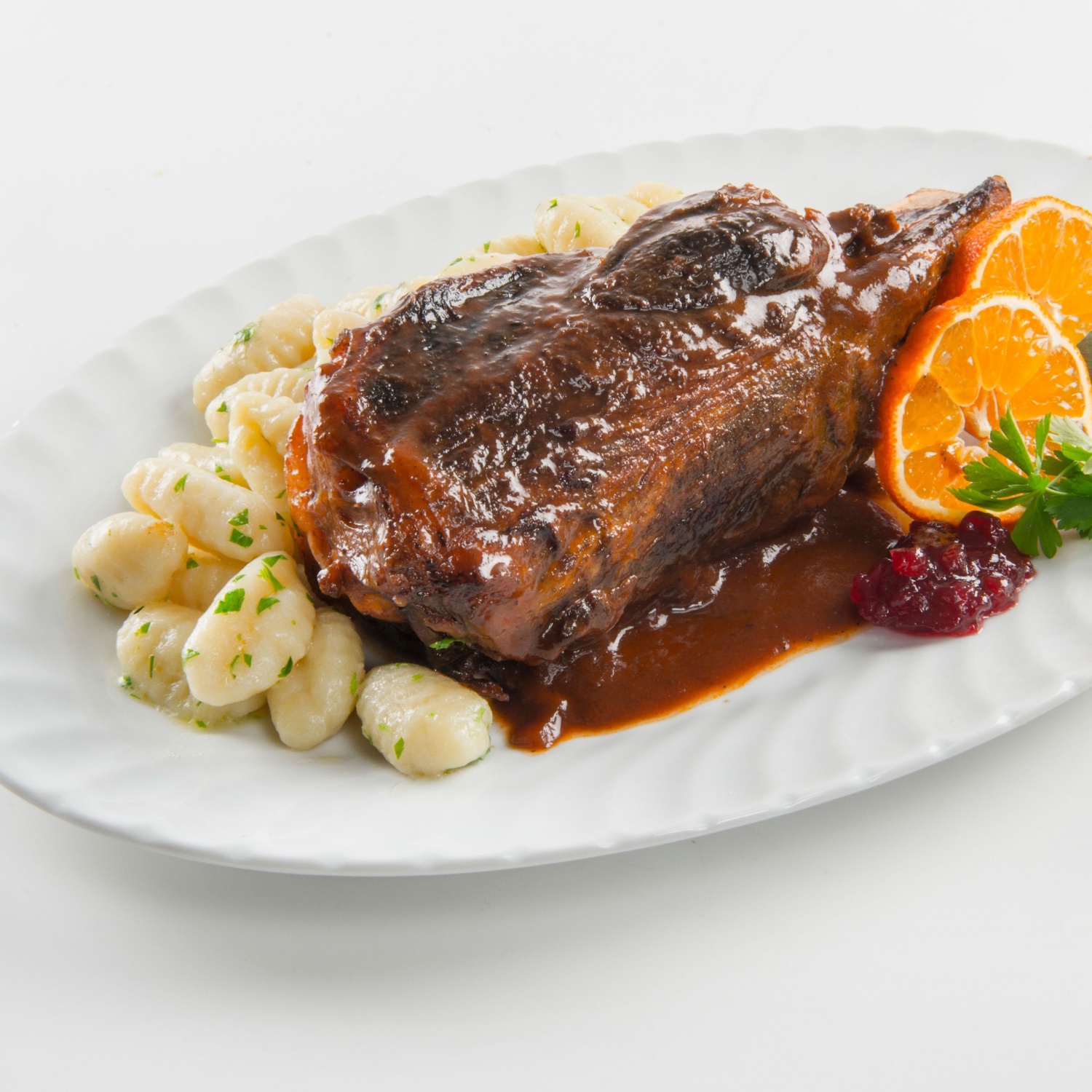Počasi pečene krače divjega prašiča z njoki