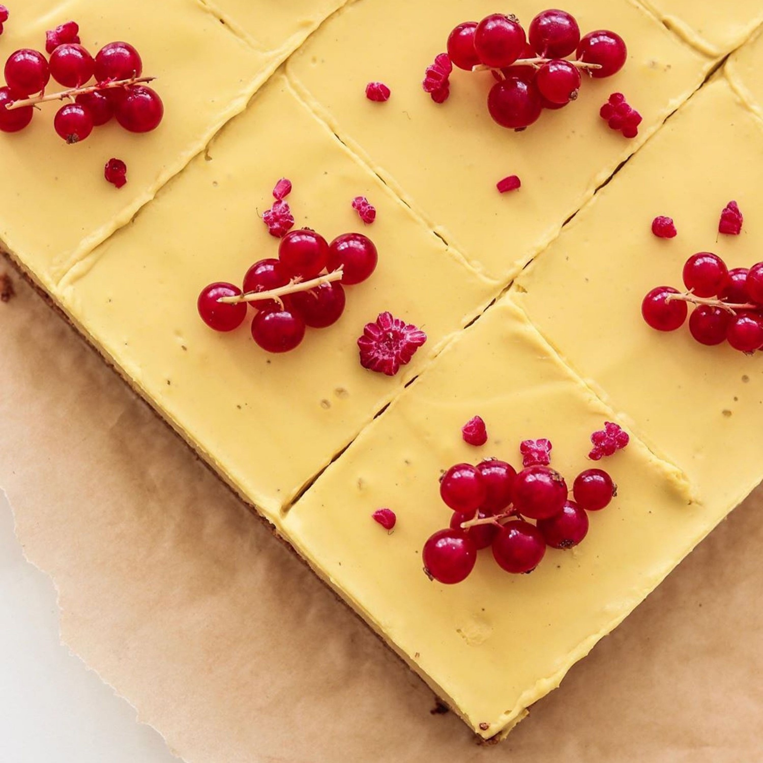 Vse sestavine, razen kokosovega olja, zmešajte v mešalniku do gladkega, nato pa dodajte še kokosovo olje. Vlijte v pekač in pustite, da se strdi v hladilniku (od 6 do 8 ur) ali v zamrzovalnik (2 uri). Dekorirajte z ribezom.