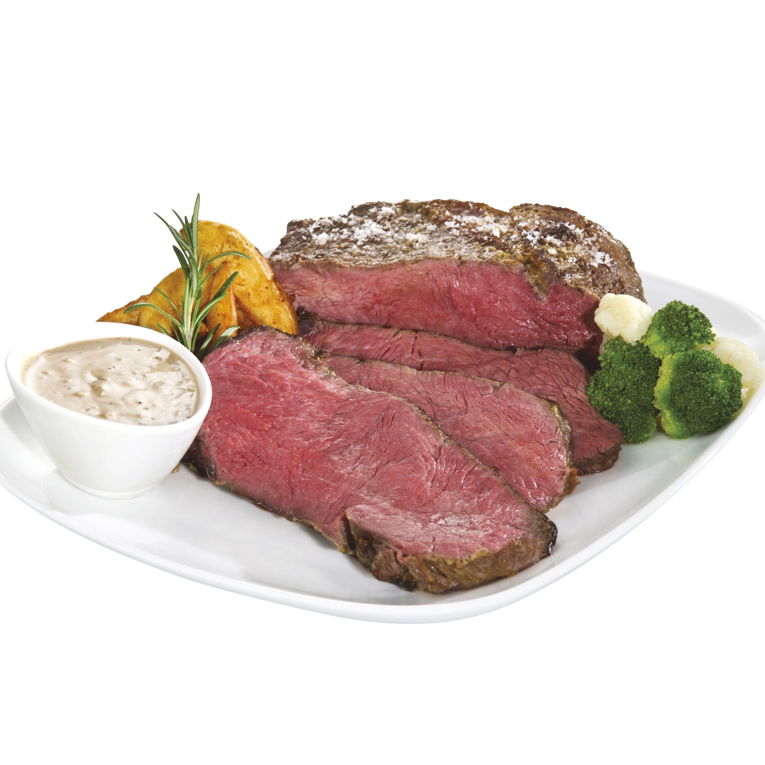 Rostbif s poprovo omako z viskijem, s hrustljavim krompirjem v kosih ter kuhano cvetačo in brokolijem