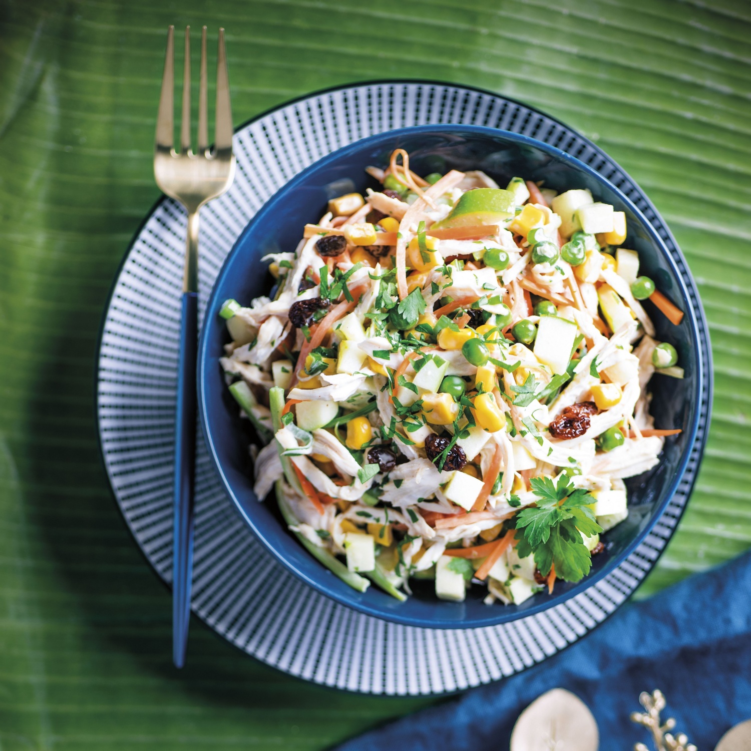 - Piščančje prsi, korenje, zeleno, jabolko, rozine, koruzo in grah zmešamo v veliki skledi in prelijemo s prelivom.