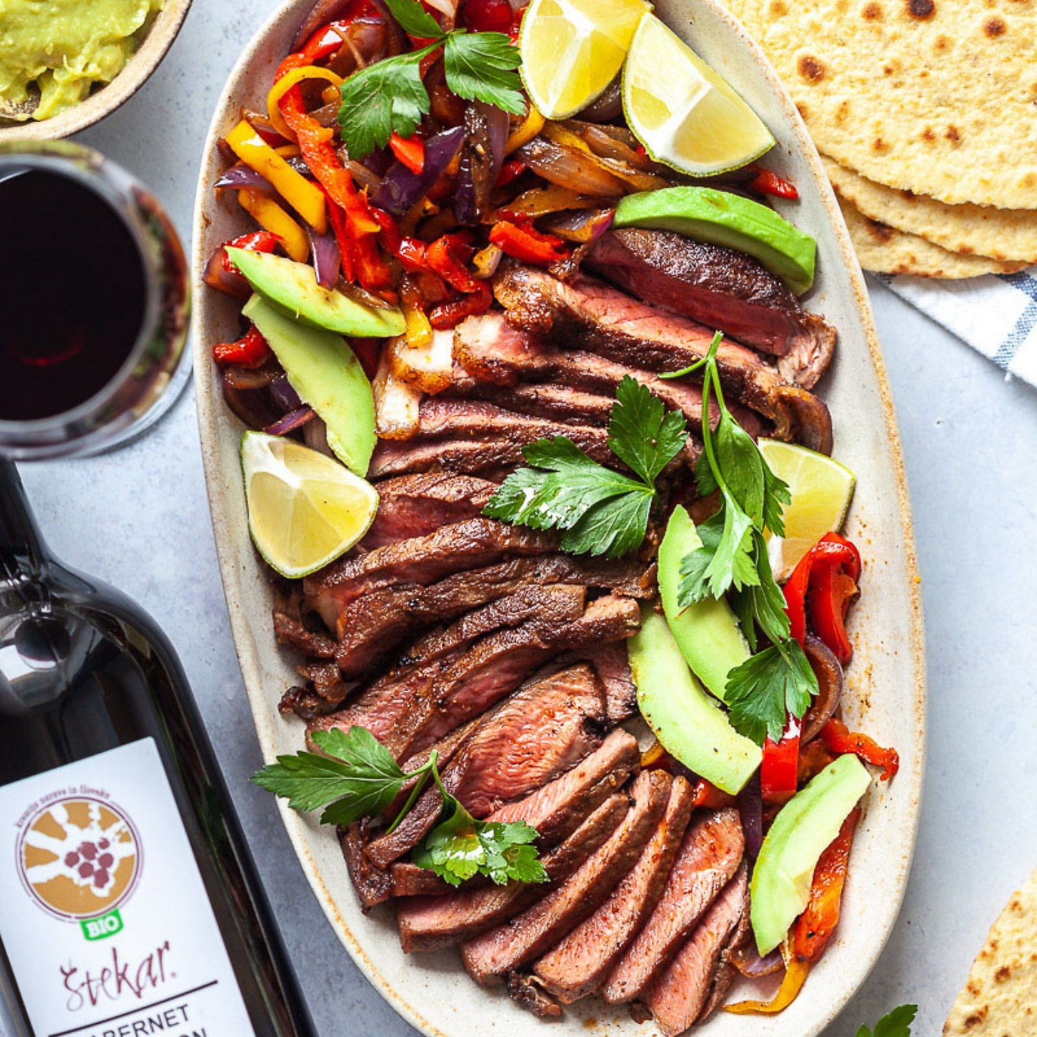 Dober zrezek s pečenimi paprikami in je pol kosila že na mizi. Za pridih eksotike v teh mrzlih dneh dodamo še avokado, guacamole in tortilje. Podroben opis spodaj
